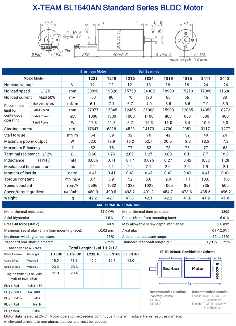 X-TEAM offers the BL1640AN standard series coreless BLDC motor, including models 1231, 1219, 1216, 1834, 1819, 1815, 2417, and 2412. These models vary in aspects such as voltage, rotational speed, and torque to meet different application requirements.