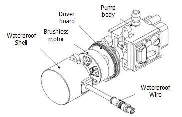 7. diaphragm pump in the three-phase DC diaphragm pump for soft start, no shock, start power consumption is small, the circuit board and the pump body are completely separated, the pump body inside