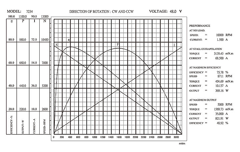 High Efficiency: The 7234 DC brushless motor for electrical tools can efficiently convert electrical energy into mechanical energy at the high-efficiency operating point, with a maximum efficiency of up to 75.78%. This not only improves the performance of the equipment but also reduces energy waste.