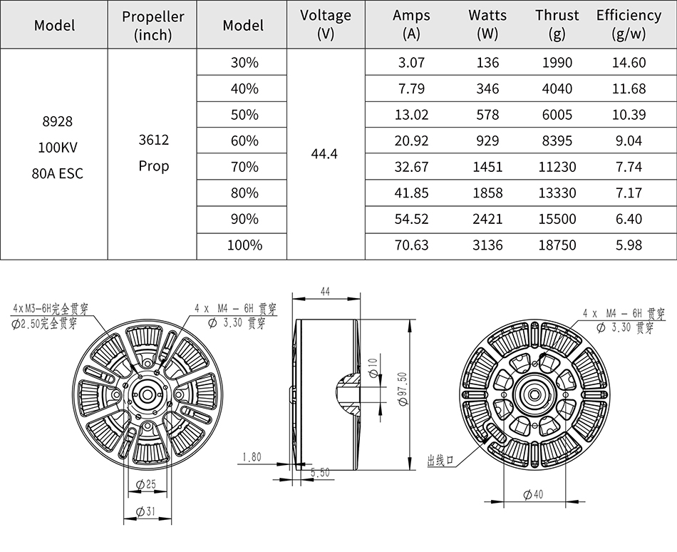 Power Supply Matching: Strictly use 10-12S lithium polymer batteries (37.0V-50.4V). Overvoltage may cause the motor to burn out.