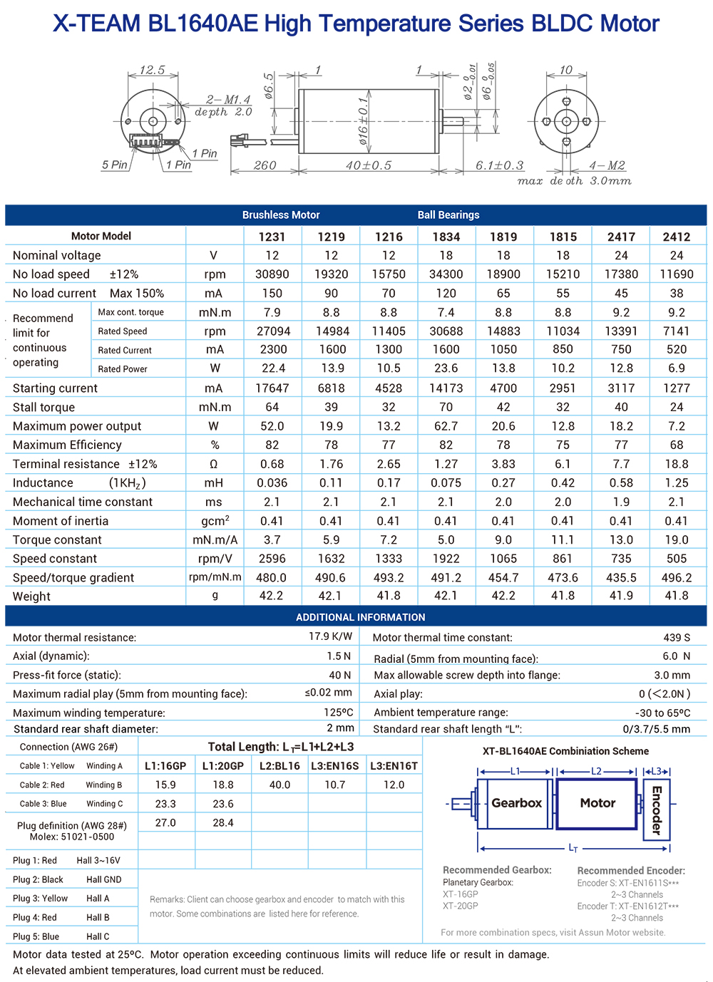 Motor Model: The BL1640AE high temperature series coreless BLDC motor series offers a variety of model options, such as 1231, 1219, 1216, 1834, 1819, 1815, 2417, and 2412, to meet different application requirements.
