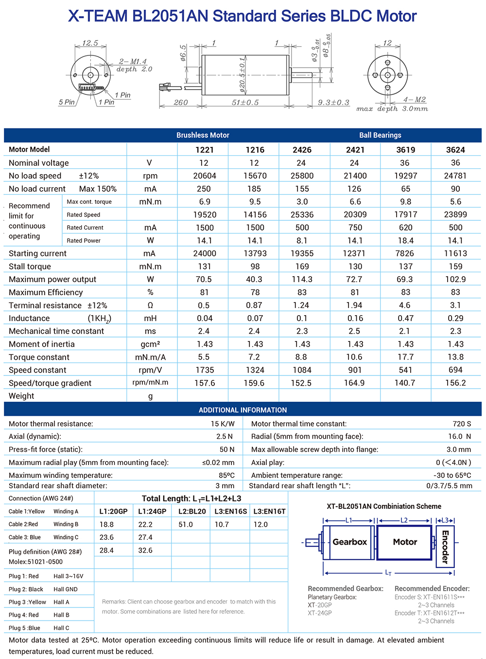 X-TEAM offers various models of the BL2051AN standard series coreless BLDC motor, including 1221, 1216, 2426, 2421, 3619, and 3624. These models vary in aspects such as voltage, rotational speed, and torque to meet different application requirements.