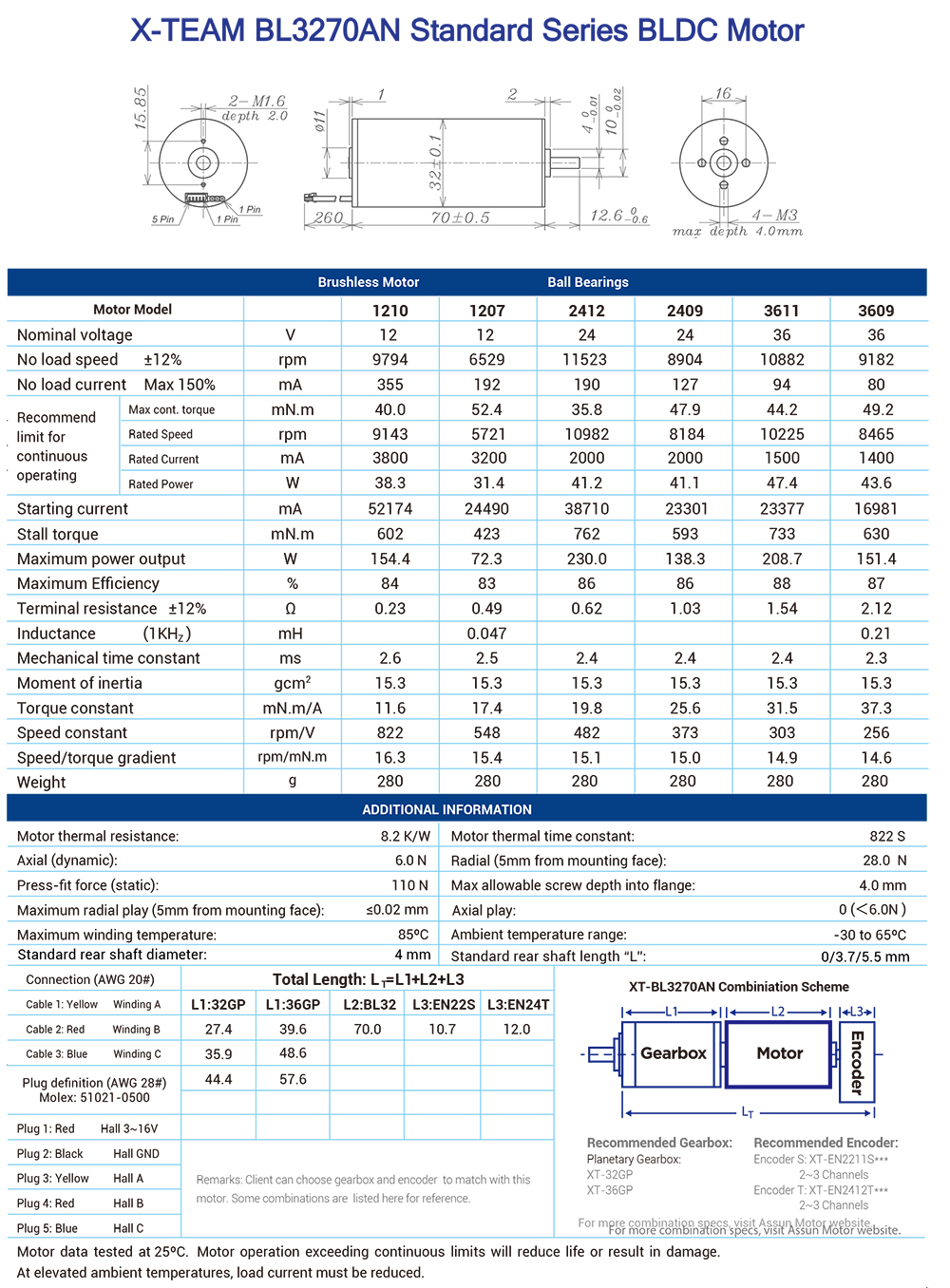 X-TEAM provides a variety of models of the BL3270AN standard series coreless BLDC motor, including 1210, 1207, 2412, 2409, 3611, and 3609. These models differ in terms of voltage, speed, torque, etc., to meet different application needs.
