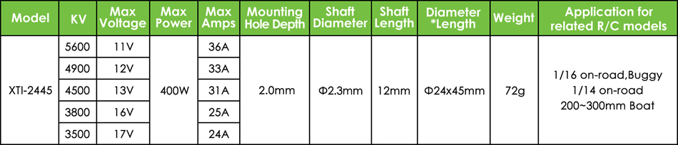 The XTI-2445 Inrunner Brushless Motor for 1/16th R/C car, with its high performance, precise craftsmanship, and diverse applications, has become the first choice for upgrading the power of small remote control models. Through reasonable configuration and standardized operation, the safety and durability of the equipment are ensured. Whether it is for on-road racing, off-road use, or small model applications, the XTI-2445 Inrunner Brushless Motor for 1/16th R/C car can provide strong power and reliable performance.