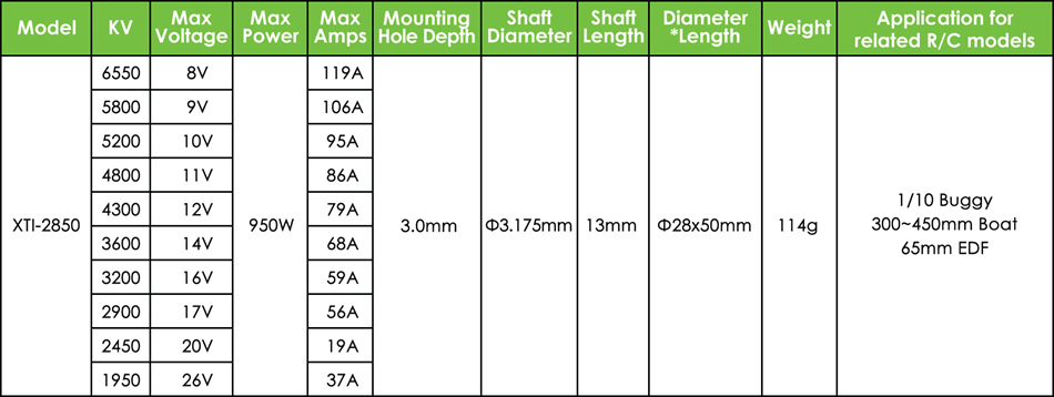 The XTI-2850 Inrunner Brushless Motor for 1/12th R/C car is an inrunner brushless DC motor specifically designed for high-performance remote control models. It is suitable for application scenarios such as 1/10 off-road vehicles and 65 mm EDF (Electric Ducted Fan). With its compact size, lightweight design, and a peak power of up to 950 watts, the XTI-2850 Inrunner Brushless Motor for 1/12th R/C car has become an ideal choice for players who pursue speed and efficiency.