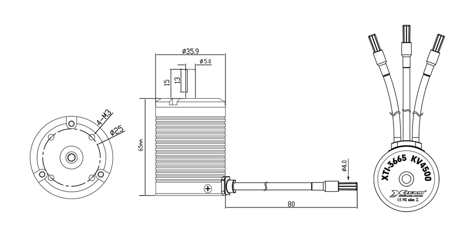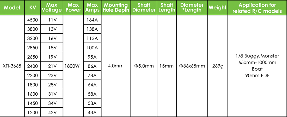The XTI-3665 Inrunner Brushless Motor for 1/10th R/C car is suitable for 1/8 scale off-road vehicles and monster trucks, as well as ship models with a length ranging from 650mm to 1000mm and 90mm electric boats (EDF). Whether for land or water models, it can provide excellent performance. Its high power and high torque output make it an ideal driving choice for model vehicles.