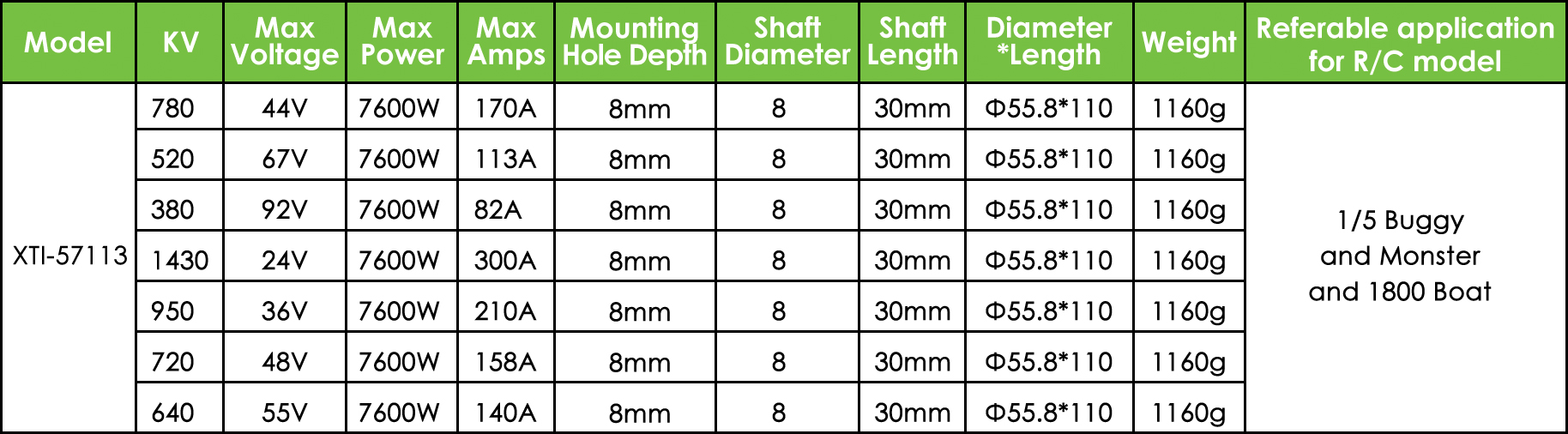 The XTI57113 high power brushless motor for car and boat model is an advanced-designed and excellent-performing component of the electric system, suitable for a variety of high-demand application scenarios. Its powerful power output and efficient energy conversion make it the choice for users of various professional RC (remote control) models.