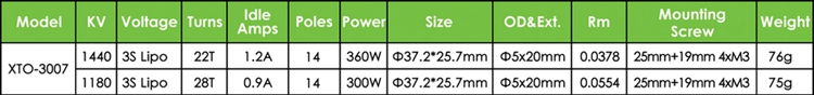 The XTO-3007 Outrunner Brushless Motor for Fixed-wing Aircraft is a high-performance and multi-specification motor product, specifically designed to meet the needs of different fields and scenarios. By adopting advanced technologies and materials, it ensures the characteristics of high efficiency, stability, and durability. The XTO-3007 Outrunner Brushless Motor for Fixed-wing Aircraft is specifically designed to meet the flight requirements of model aircraft such as large park flyers, 3D aerobatic planes, scale models, and helicopters. It is suitable for models equipped with 2 to 4 LiPoly batteries, and the maximum takeoff weight can reach 3200 grams. With its outrunner design featuring a 14-pole stator, it has remarkable advantages such as lightweight and high quality, and can provide strong and stable power support for model aircraft flights, ensuring excellent flight performance.
